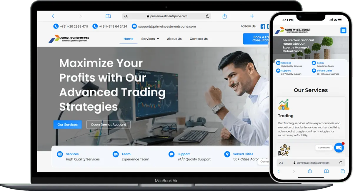 Prime Investments Pune faced the challenge of effectively showcasing their wide range of financial services on their website. Their existing site lacked a user-friendly design, making it difficult for visitors to navigate and find the information they needed. The website also didn’t effectively communicate their expertise and the variety of services offered. The goal was to create a modern, intuitive platform that would highlight their services, improve user experience, and increase conversions.