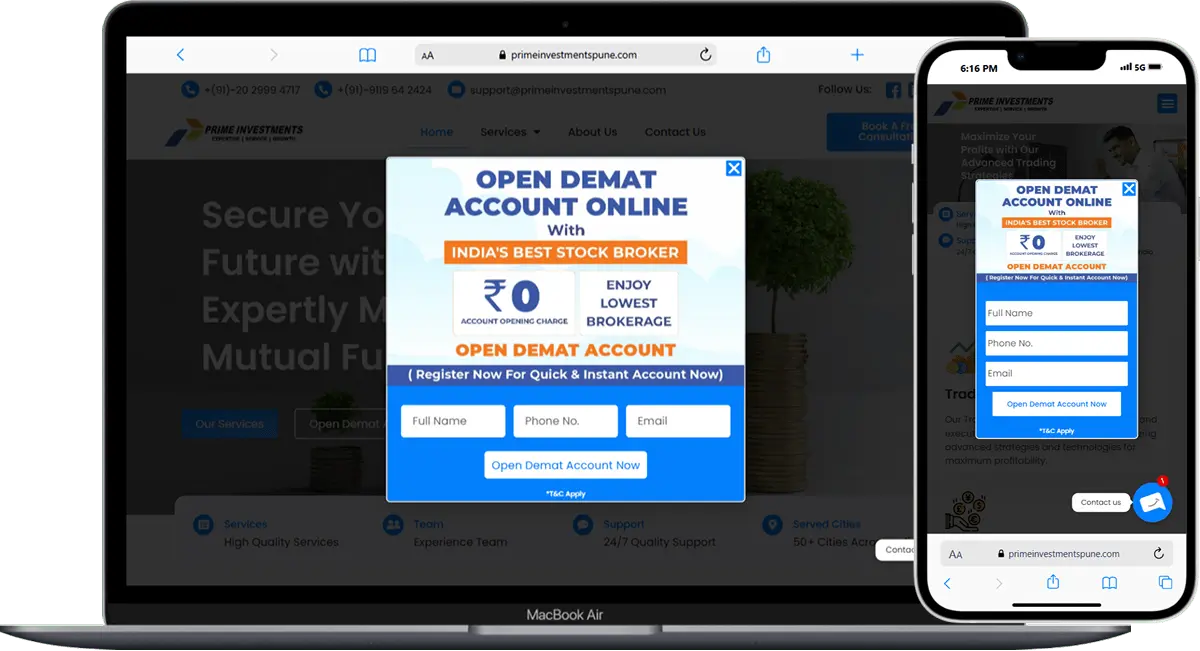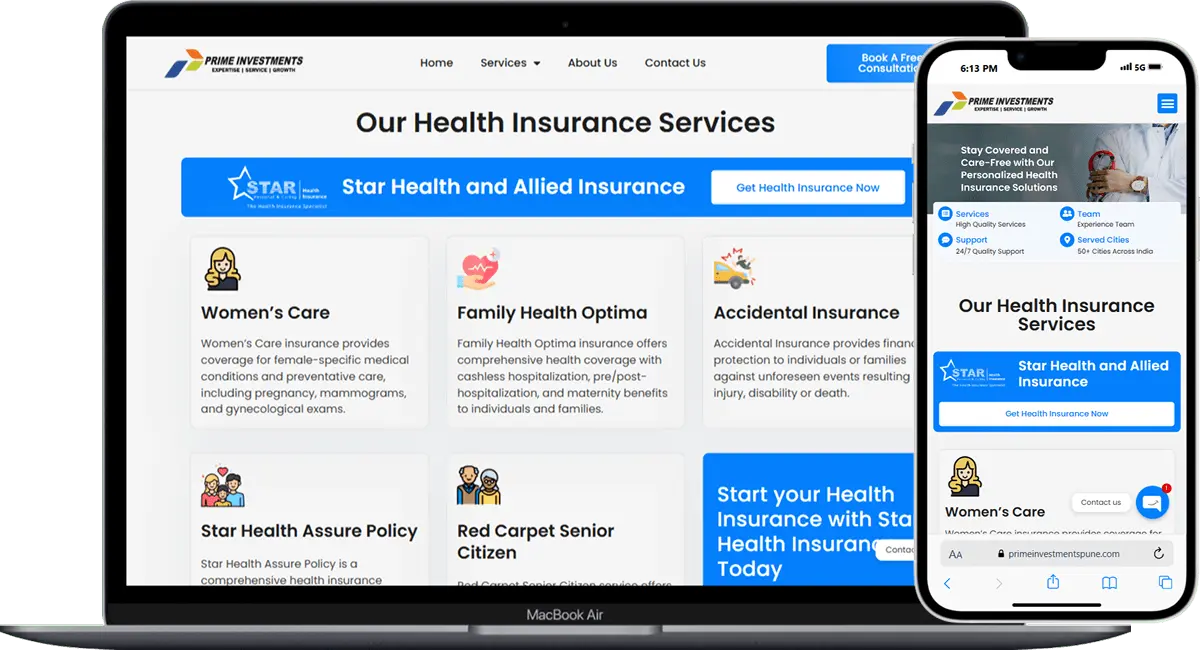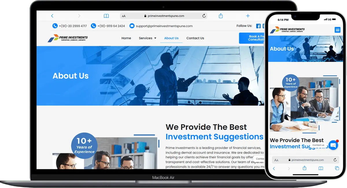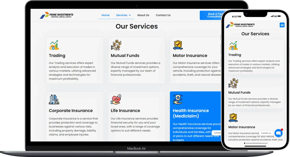 TakeUp Marketing designed and developed a user-friendly, modern website for Prime Investments Pune, focused on enhancing navigation and showcasing their comprehensive range of financial services. We optimized the site’s UI/UX to ensure a seamless experience across all devices, making it easier for visitors to explore services and make informed decisions. The new website effectively highlights Prime Investments’ expertise, driving higher engagement and conversions.